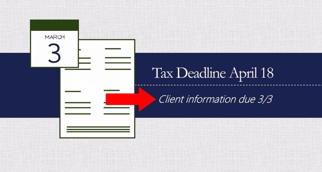 A friendly reminder to our clients: Dont forget to submit your information to us by March 3. You may do so by scanning and sending through our secure link or mail copies of the originals. If you have any questions please do not hesitate to contact our office at 210-829-1300. Mailing Address: Akin, Doherty, Klein […]