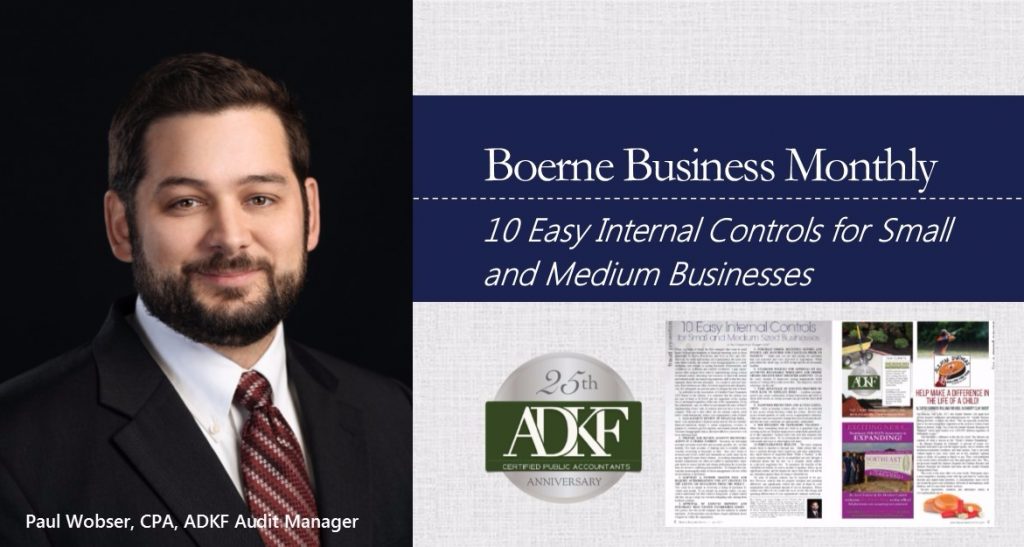Our Audit Manager, Paul Wobser, CPA, wrote an article every business owner should read to help prevent fraud. The ten controls are listed below but the full article can be found online through the Boerne Business Monthly link.10 EASY INTERNAL CONTROLS FOR SMALL AND MEDIUM SIZED BUSINESSES Management review of financial data Prepare and review […]