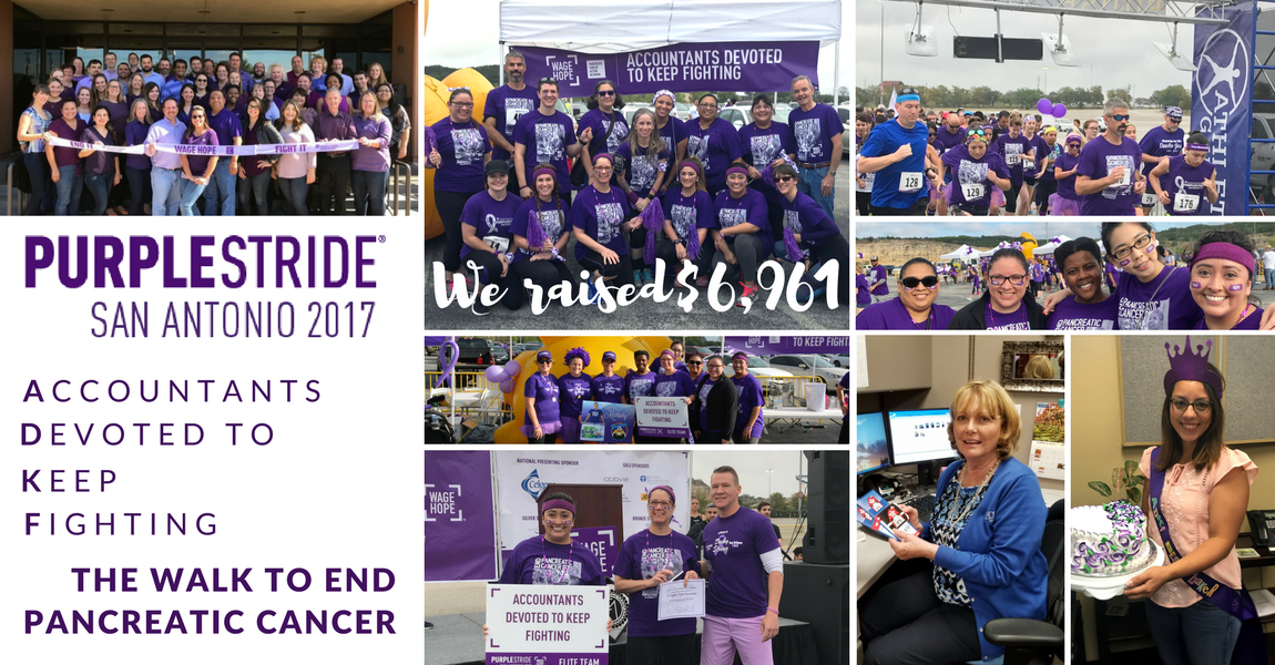 First, thank you to everyone who joined the fight against pancreatic cancer. Your action moves mountains for the thousands of families affected by this disease each year. Pancreatic cancer has the lowest survival rate of all major cancers, at just 9%. This deadly disease has stolen family members and loved ones from our ADKF team. As recently as this year, Debra Allen lost her husband Ray Allen in June. Audit Partner, Susan Valdez, lost her brother and sister after their individual battles of six months and 18 months after being diagnosed. Susan is participating in PurpleStride for her 5th year in a row. Our team kicked off our fundraising efforts by submitting team names. Jennifer Grahams submission, Accountant San Antonio Devoted to Keep Fighting was chosen as the winning name. This year our fundraising committee was headed by: Kelly Boswell, Melanie Gamez, Nancy Meza, Anette Rocha, Susan Valdez, and Cristina Zalaznik. The volunteers from PurpleStride presented information about the disease and shared with us how our donation makes a difference. Just three hours after the presentation team ADKF raised over $1,000, which showed how inspired everyone was to take action. Our Friday Jean Pass fundraiser was also a hit with staff members who look forward to a casual Friday wardrobe during the fall. We also held an ADKF Bake Off, where Annette Rocha took the title of, ADKFs Best Baker. Staff around the office sold snacks from their desk along with a firm wide bake sale to help us reach our goal. Debra Allen was awarded the overall top fundraiser for team ADKF and was in the top ten from PurpleStride San Antonio, she raised $1,324 for the cause. ADKF became and Elite Team and took 2nd place for fundraising, $6,961. This was the first year the PurpleStride 5K run/walk was held at Fiesta Texas which added a change of scenery and a few hills to the race. Tyson Gaenzel, Audit Partner, won 2nd place and improved on his maneuvering skills around the walkers. We couldnt have asked for better weather and PurpleStride San Antonio reached its goal with the help of family and company teams. New Braunfels team, Ducky Strong, was the top fundraiser with $11,550. During the event, we were all moved to hear the story behind the teams and volunteers, met survivors and current cancer warriors, and felt empowered to continue the fight to end pancreatic cancer. We learned that pancreatic cancer does not have a test for early detection and when it usually is detected the cancer has already spread to other organs. Thank you again to everyone who helped coordinate and donated, your action speaks volumes. Also, special thanks to the San Antonio Pancreatic Cancer Action Network team who was extremely helpful in providing us with knowledge, swag, and support before and during race day. We fight for the more than 53,000 Americans who will be diagnosed with pancreatic cancer this year. Last year, this horrible disease surpassed breast cancer to become the third leading cause of cancer-related death in the U.S. If you are interested in joining the fight or would like information please visit: https://www.pancan.org/ Visit Accountants Devoted to Keep Finding Fundraising Page: http://support.pancan.org/goto/ADKF