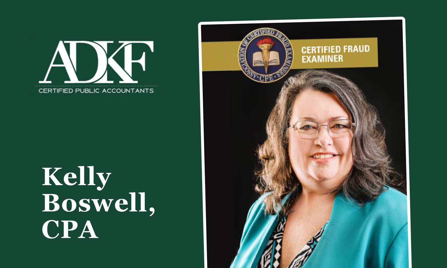 ADKF congratulates Kelly Boswell, CPA, on obtaining her Certified Fraud Examiner certification!