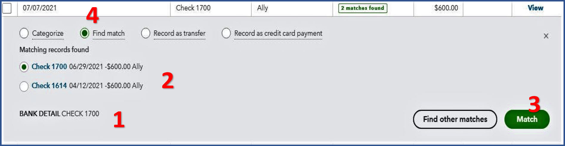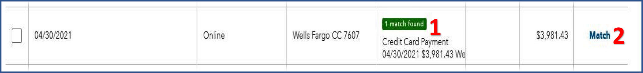 Pay close attention to the bank detail and make sure that it matches the transaction selected before you click on the Match button (3). Bank detail can include: