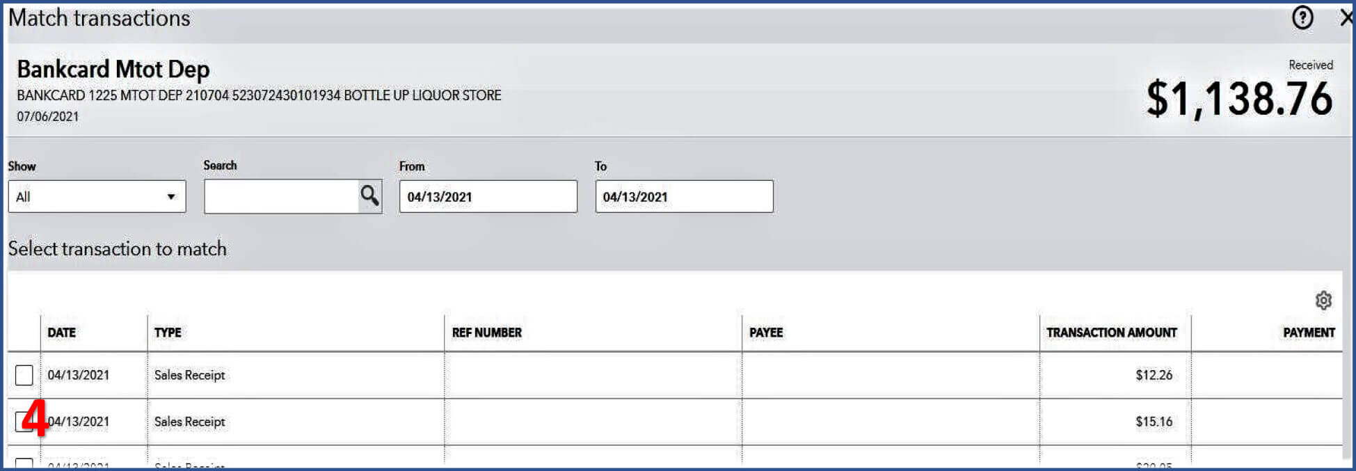 4. Select all invoices and/or Sales Receipts associated with that deposit.