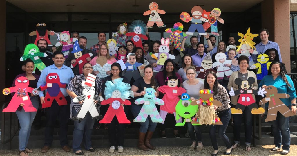 Several staff members enjoyed taking a much-needed break over the weekend to brainstorm a group theme and individual themes for this years ADKF contest. We had the leading cast from Monsters Inc. and a group who did Cat In The Hat with Things 1 and 2, two versions of Micky Mouse, two Hawaiian inspired kids, superheroes, Pikachu, the Easter Bunny, and a Minion. Another team favorite was Houston Rockets player James Harden with Spurs player Manu Ginobili stealing the ball. The staff created a total of 33 Cardboard Kids for the campaign.